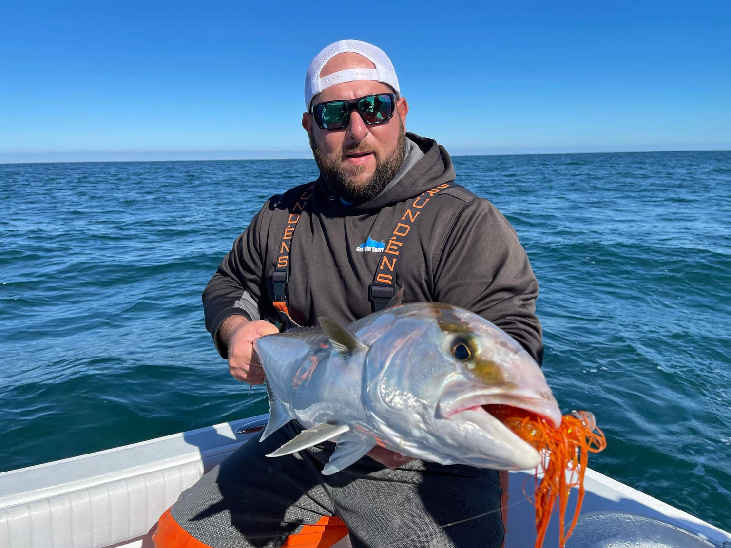 Al's Super Tandem Mojo Rig is made with 100 pound test Owner Hooks, 6 ounces on the bottom 2 ounces on top built on a three-way swivel and hand crimped (no knots) the bottom bait will drop 4 feet from the three-way and the top it will go back 10 feet.